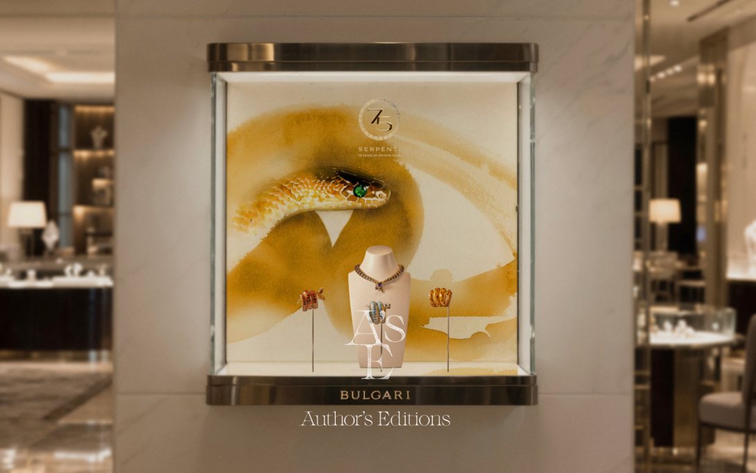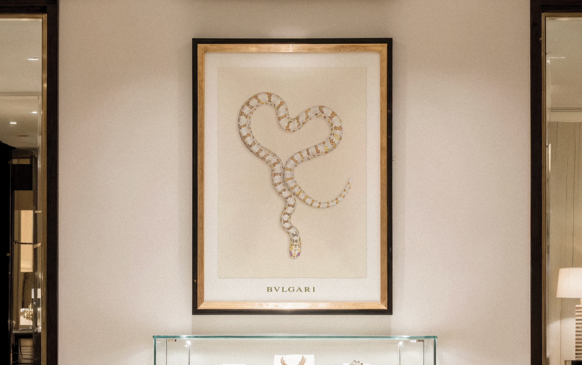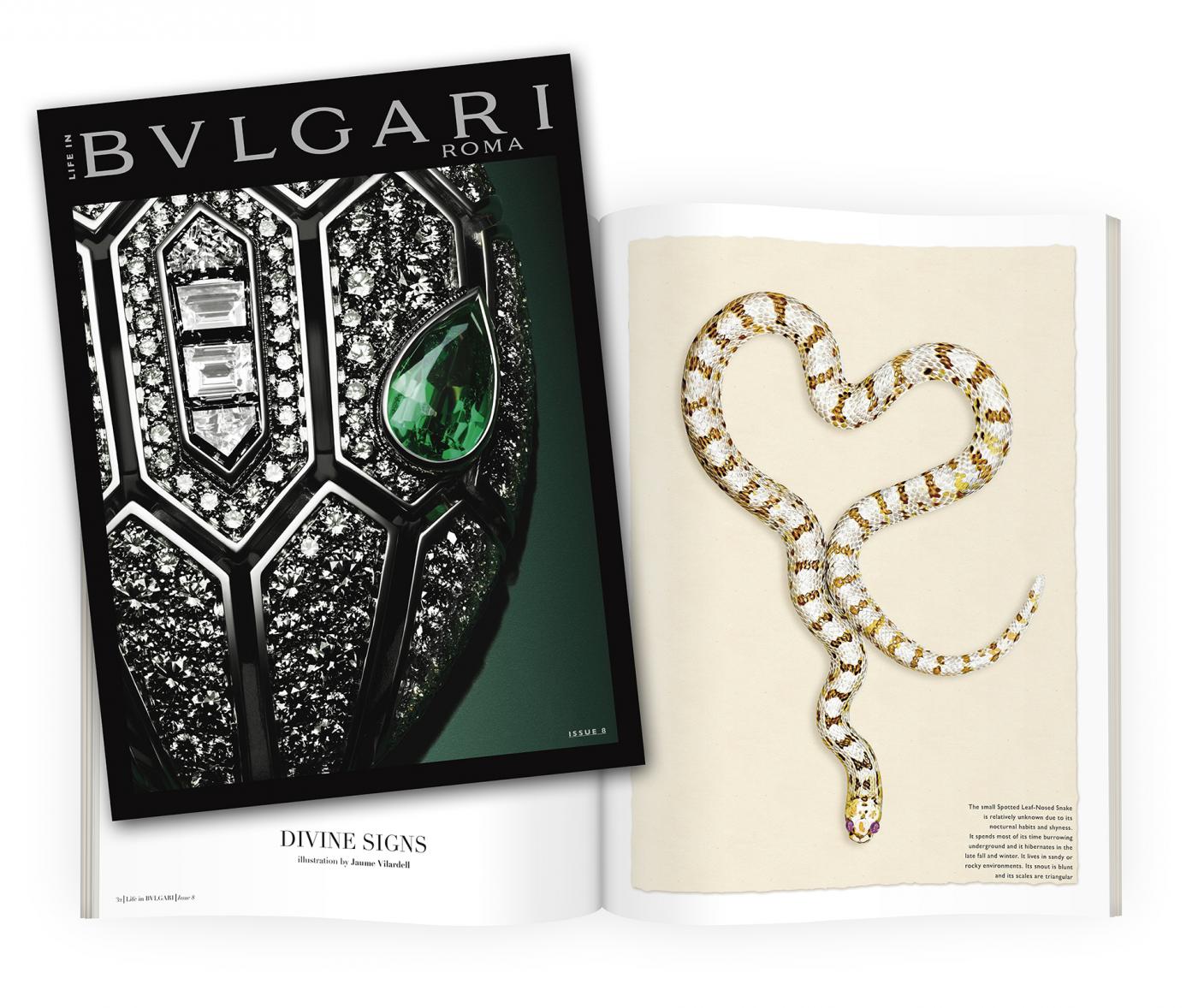 Jaume Vilardell was commissioned by Bulgari for its Life in BVLGARI magazine to create the series Divine Signs. The challenge was to reinterpret different snake species—such as the Spotted Leaf-Nosed Snake, the Banded Krait, and the Rainbow Water Snake—and transform them into illustrations that evoked jewels, crafted from metals and precious stones. The result was seven striking plates in which the anatomy and movement of each serpent became designs of high jewelry, capturing the elegance, detail, and iconic character of Bulgari’s universe
