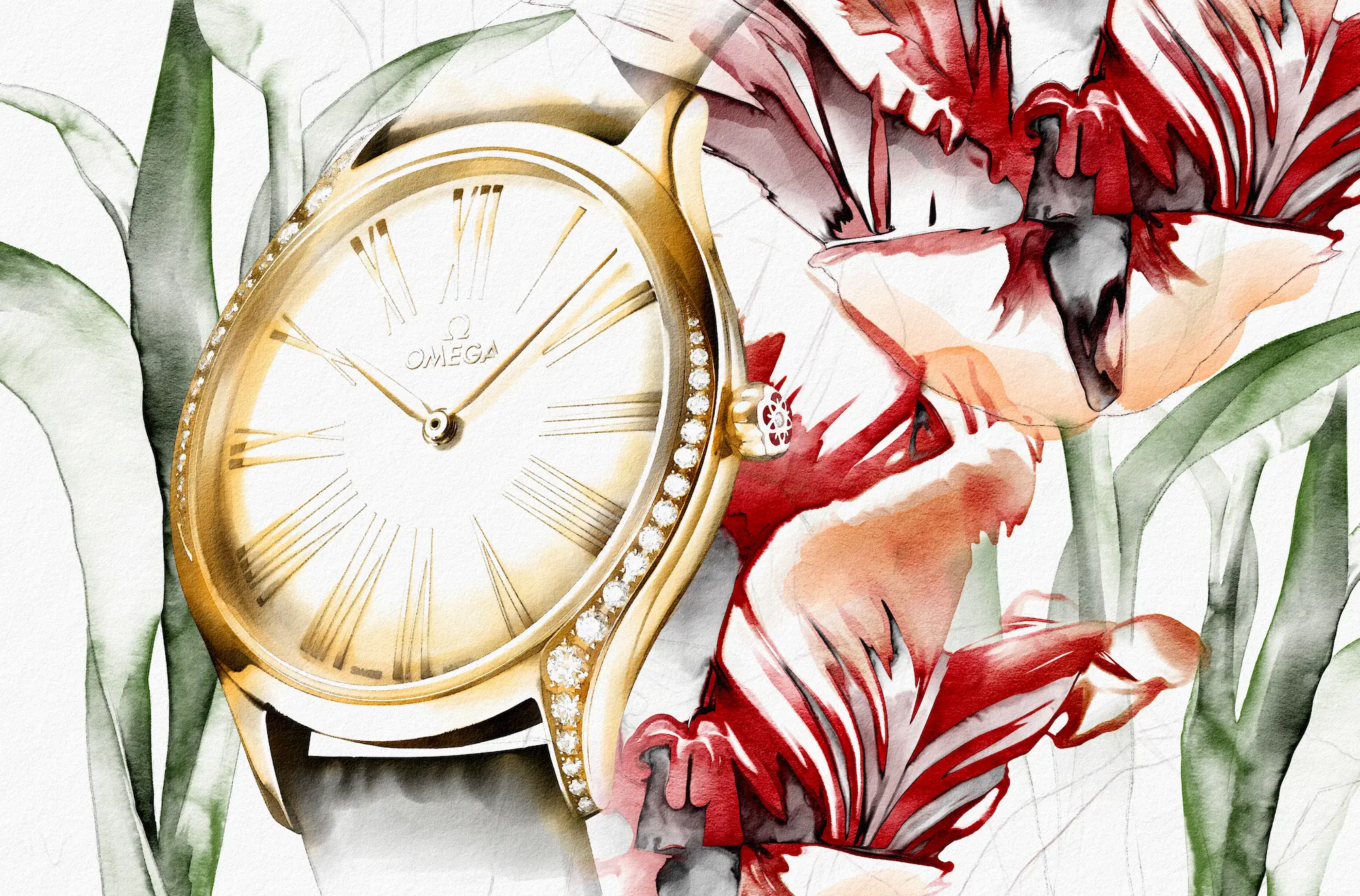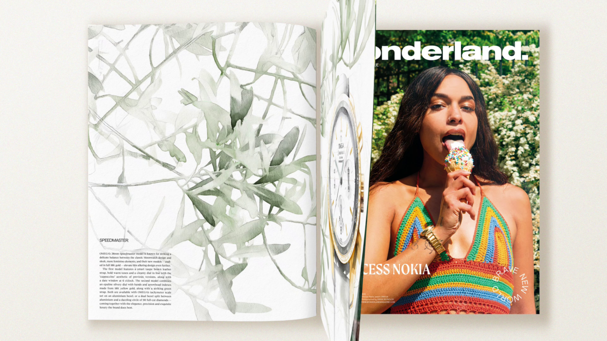 In this Omega editorial for Wonderland magazine, illustrator Jaume Vilardell was commissioned to bring Omega’s Trésor watches into a new dimension, combining their refined lines with oversized floral elements. The slim cases, domed dials and diamond accents were amplified through watercolour illustrations, where each petal and stem framed the timepieces, turning technical precision into an immersive, poetic visual experience with strong potential for large-scale applications in commercial spaces, where their delicate details create a powerful visual impact.